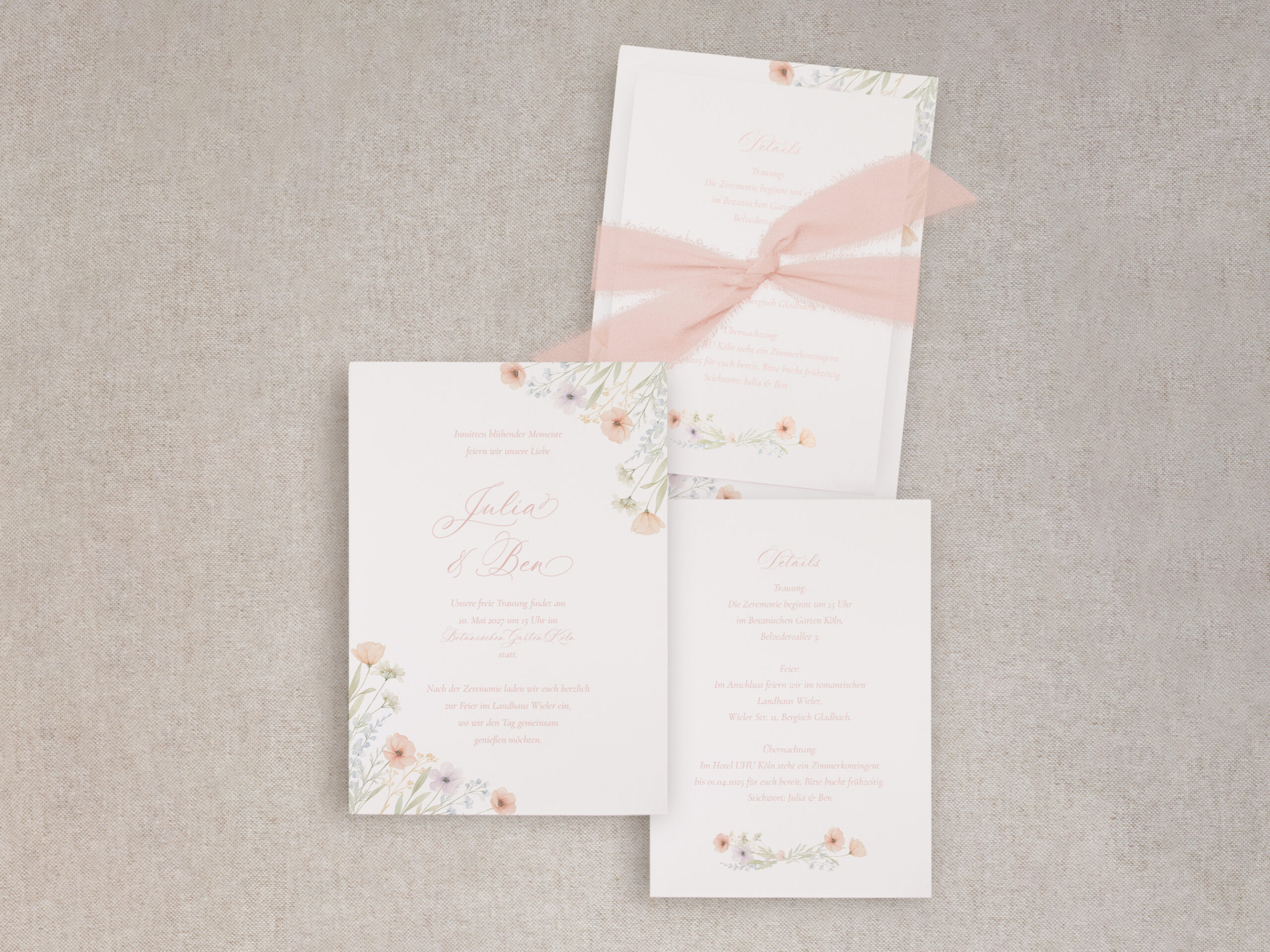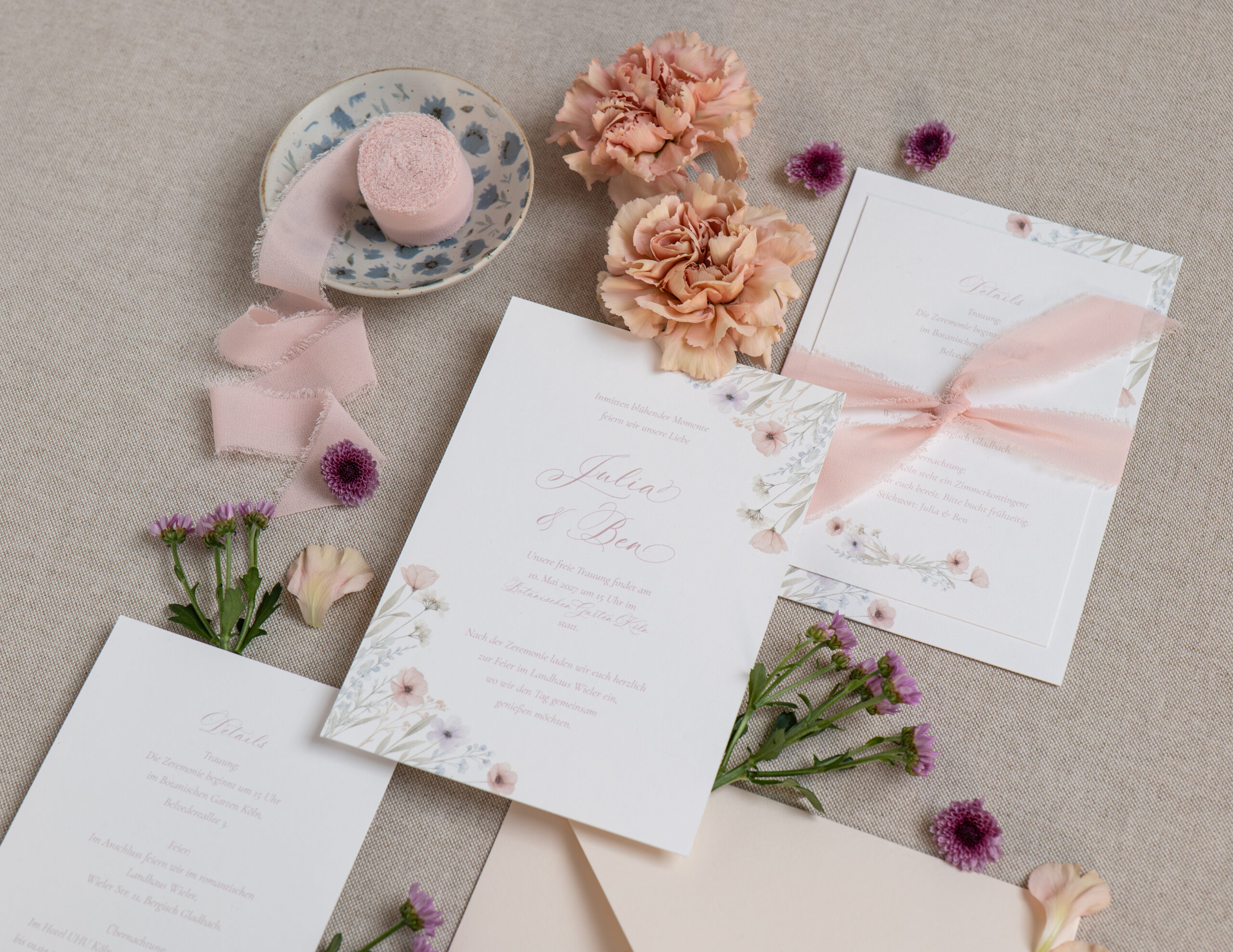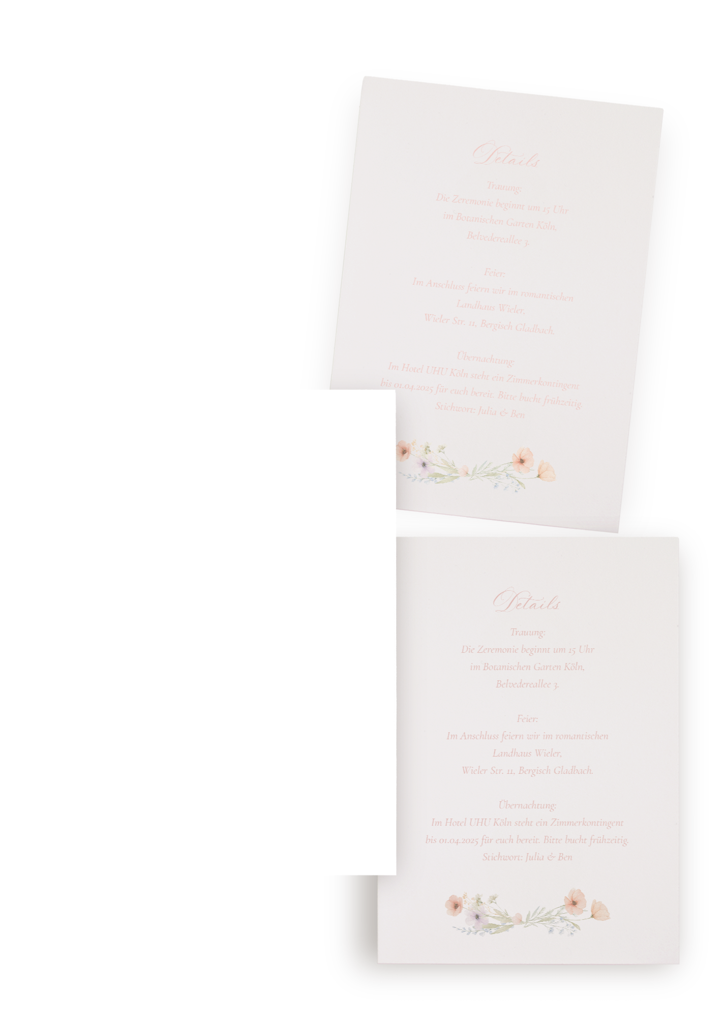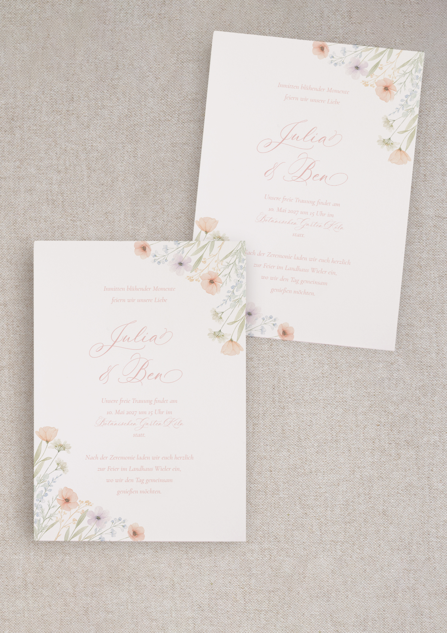Die Hochzeitseinladung – Blossom Whisper – vereint zarte Aquarellblüten, feine Pastelltöne und eine leichte, romantische Verspieltheit – ideal für Paare, die den Frühling und eine natürliche, liebevolle Hochzeitsästhetik widerspiegeln möchten.