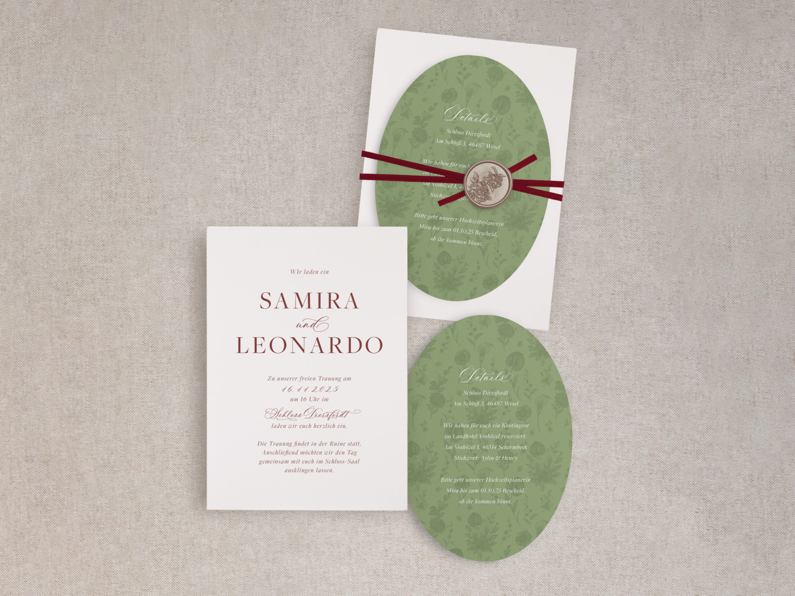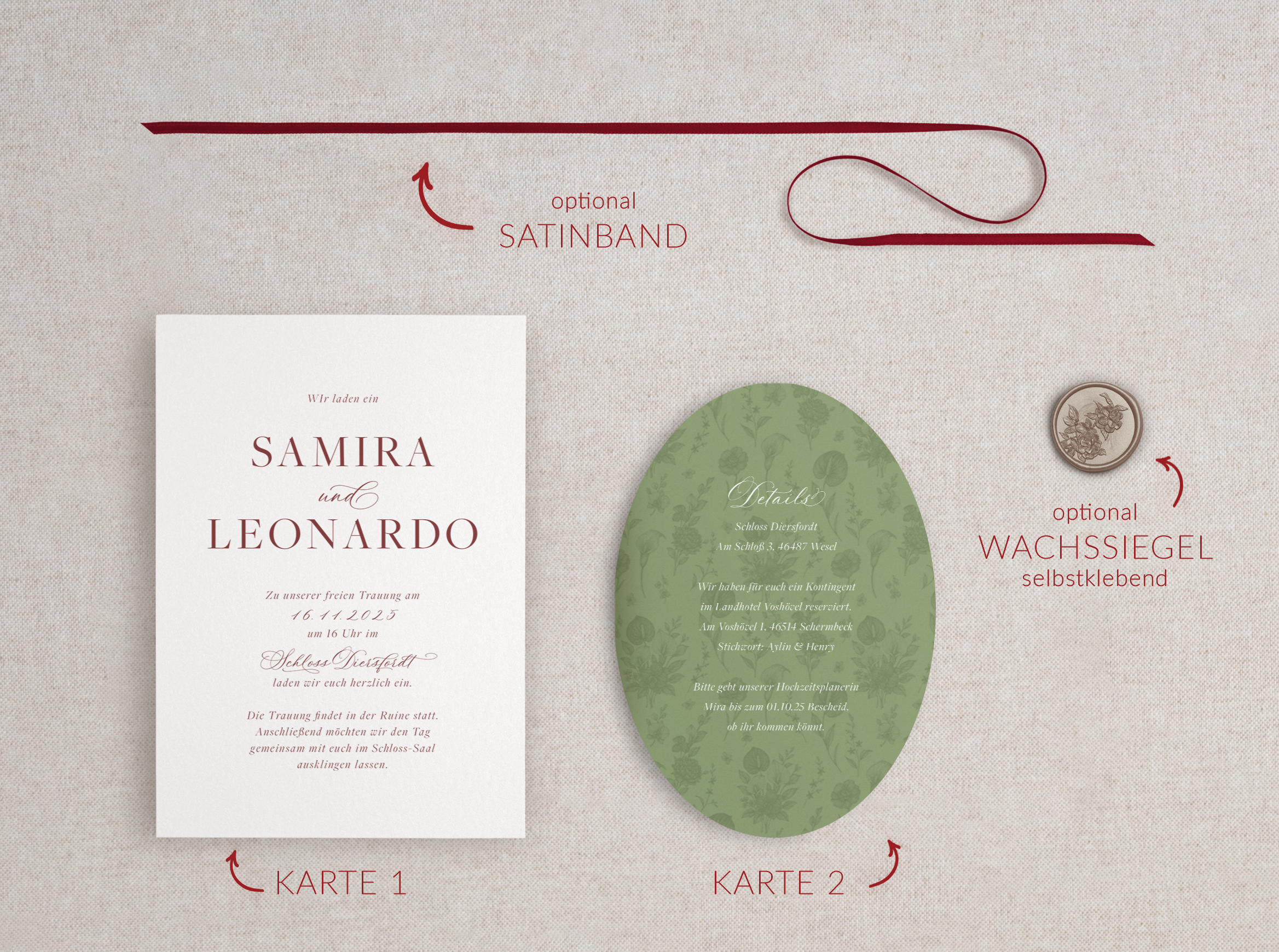 Dieses Design ist Teil einer kompletten Serie. Umschläge, Save-the-Date-Karten, Menü- und Dankeskarten im selben Stil findest du direkt hier bei uns im Shop.
