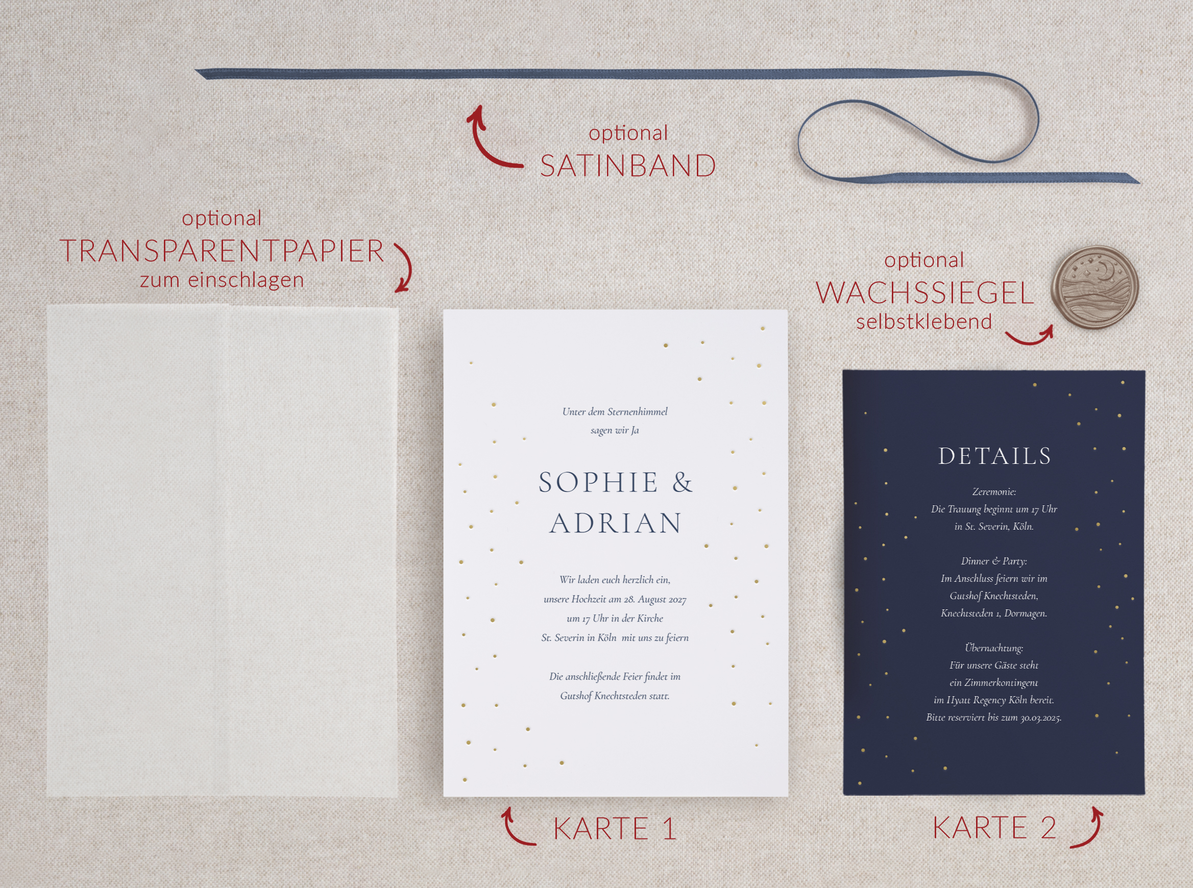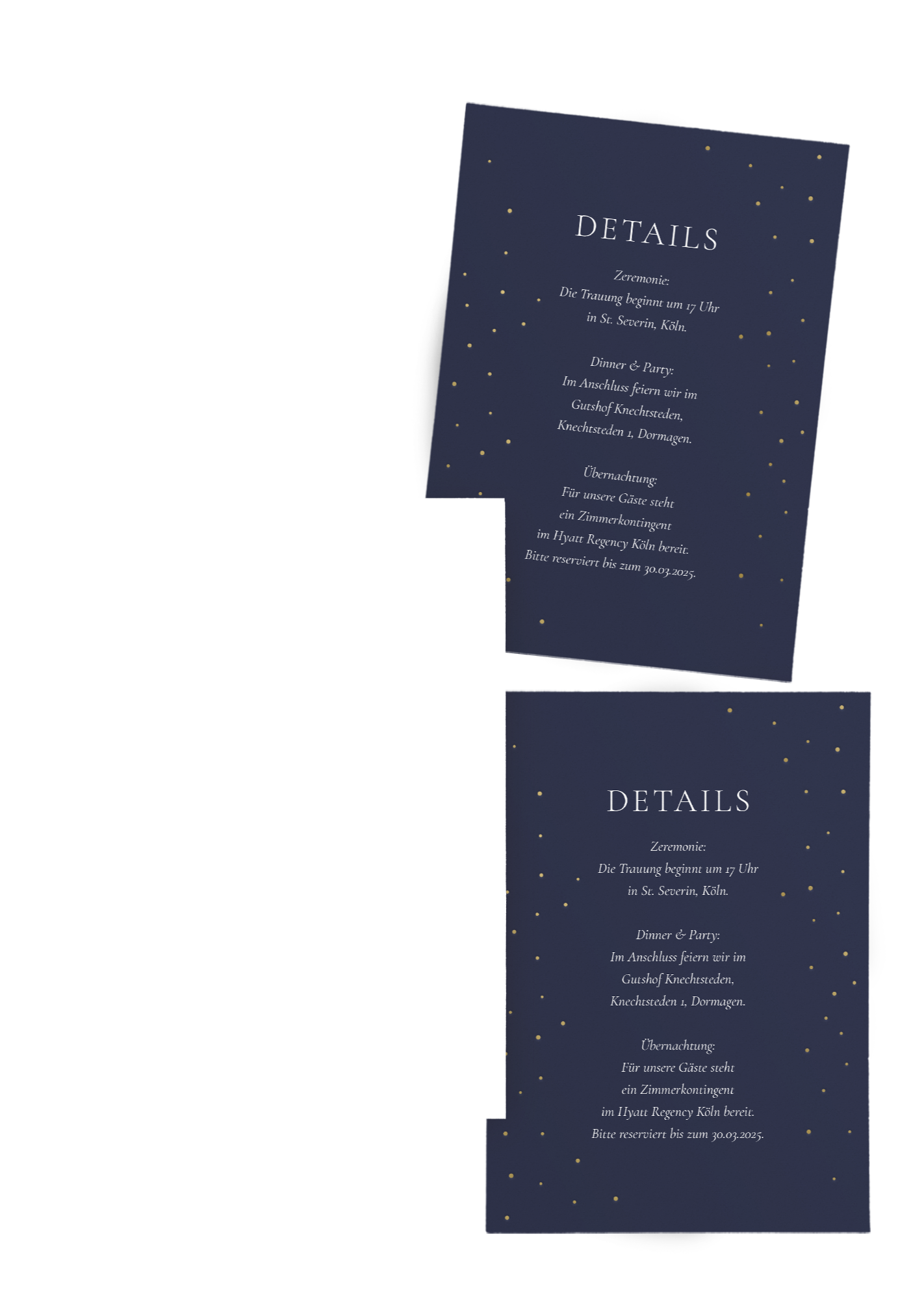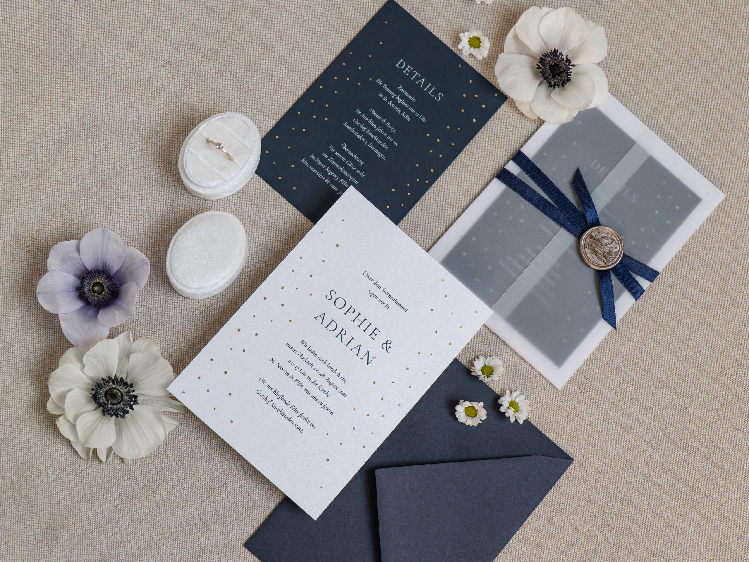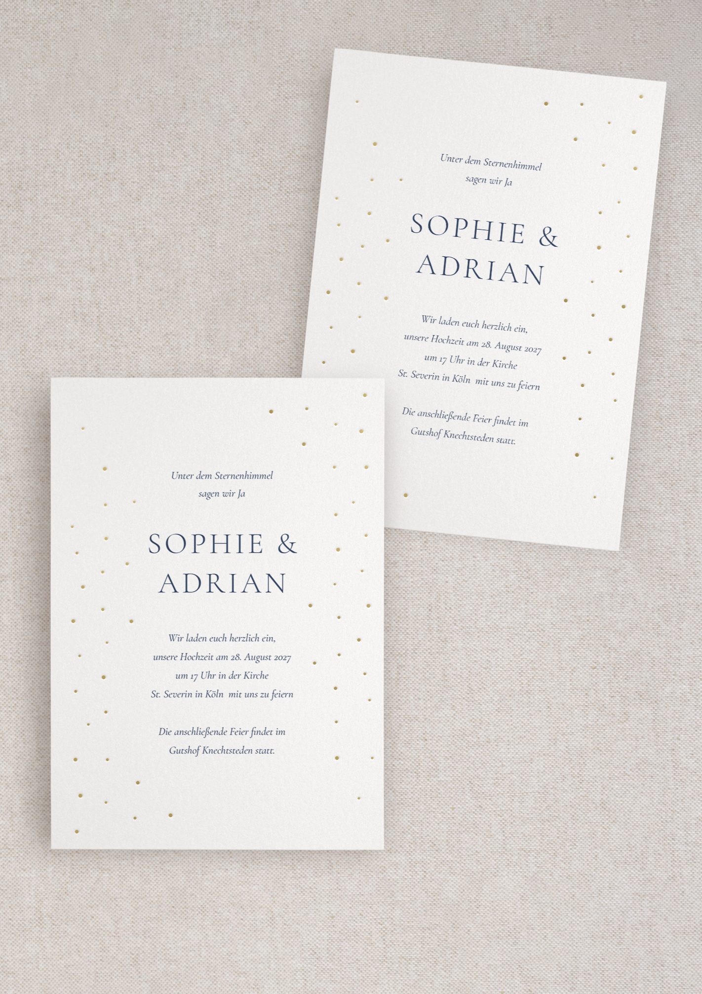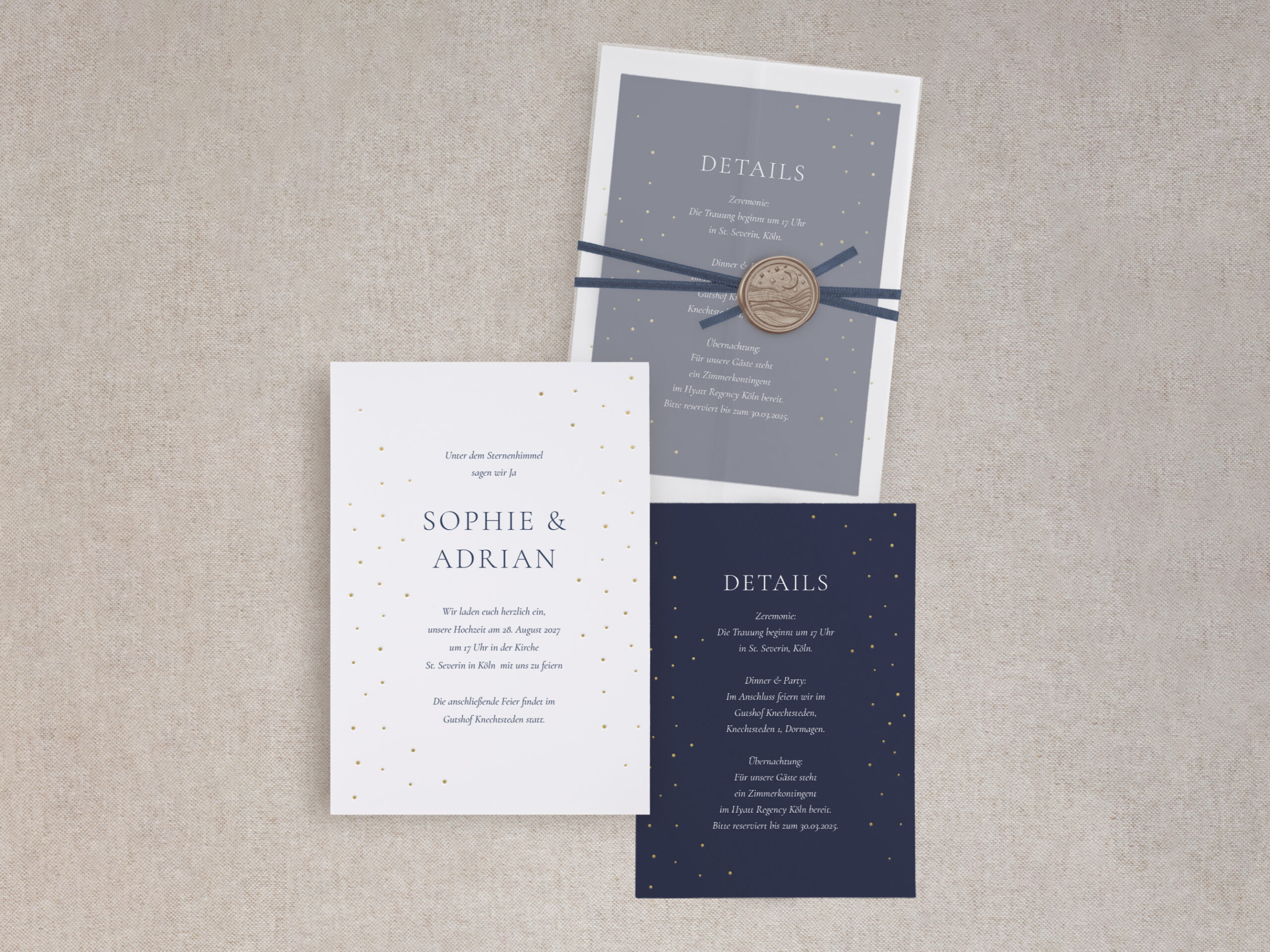 Die Hochzeitseinladung – Midnight Elegance – vereint tiefe Farben, feine Sternenakzente und edle Goldfolienelemente zu einer ausdrucksstarken Papeterie mit moderner Eleganz – perfekt für Paare, die einen stilvollen, festlichen und zeitlos luxuriösen Hochzeitslook suchen.