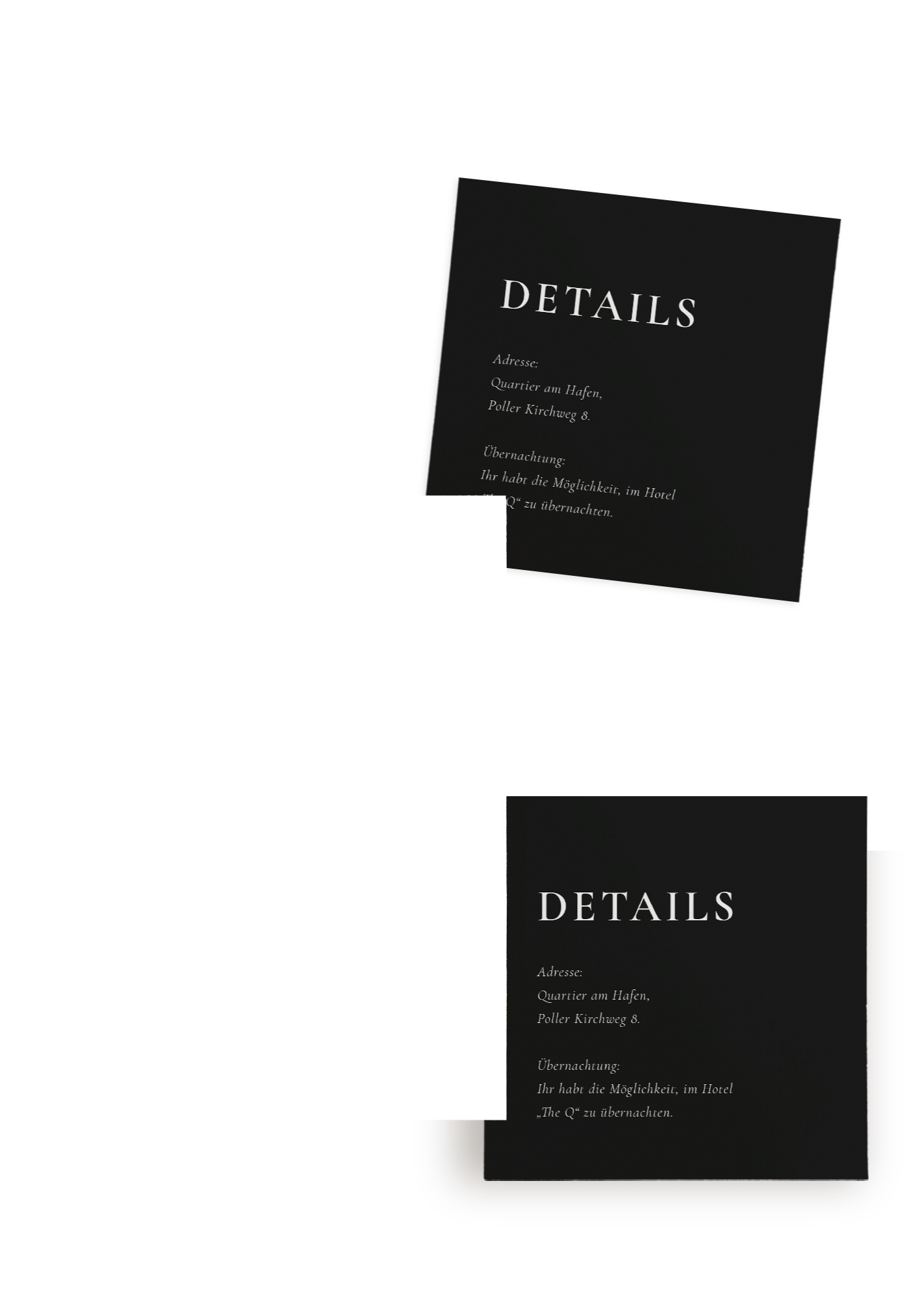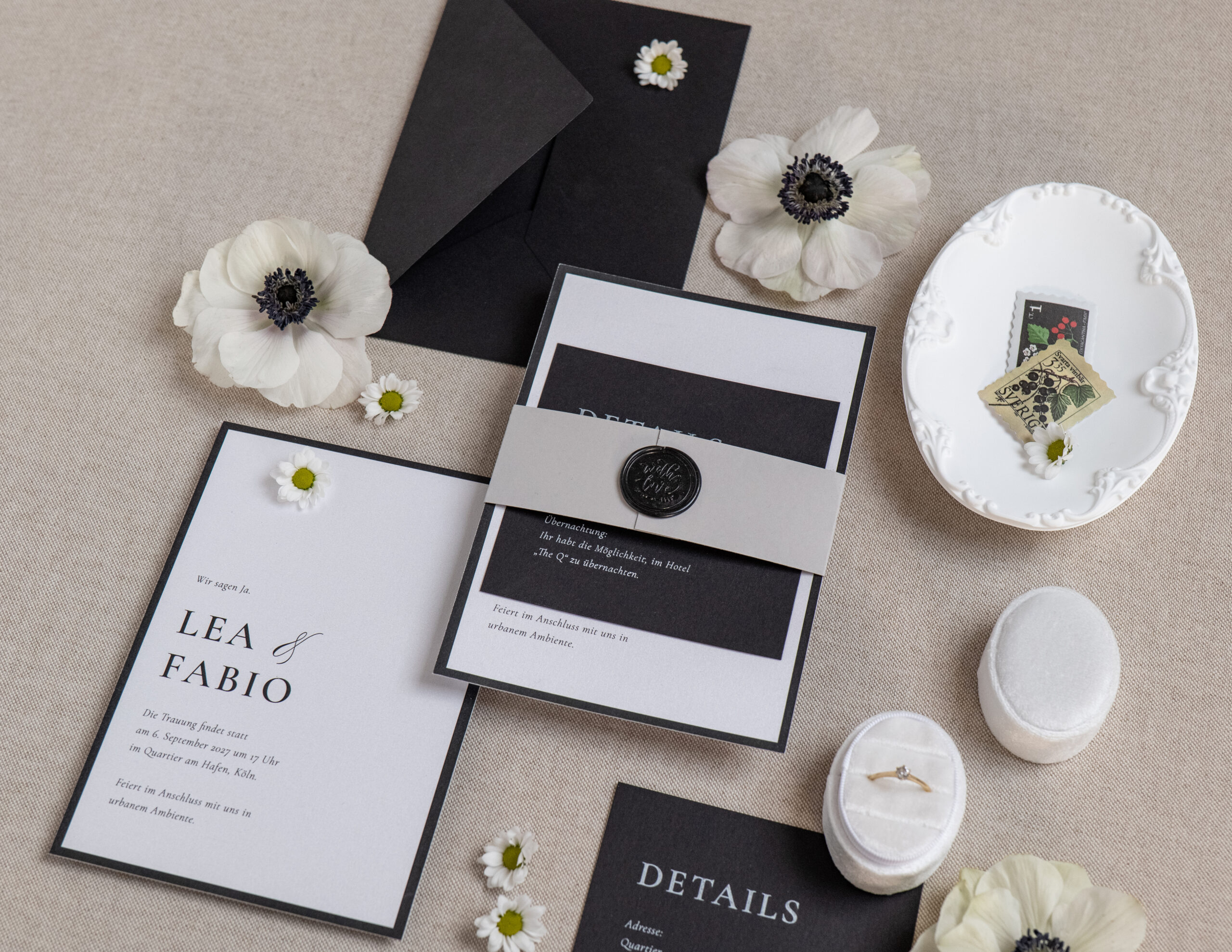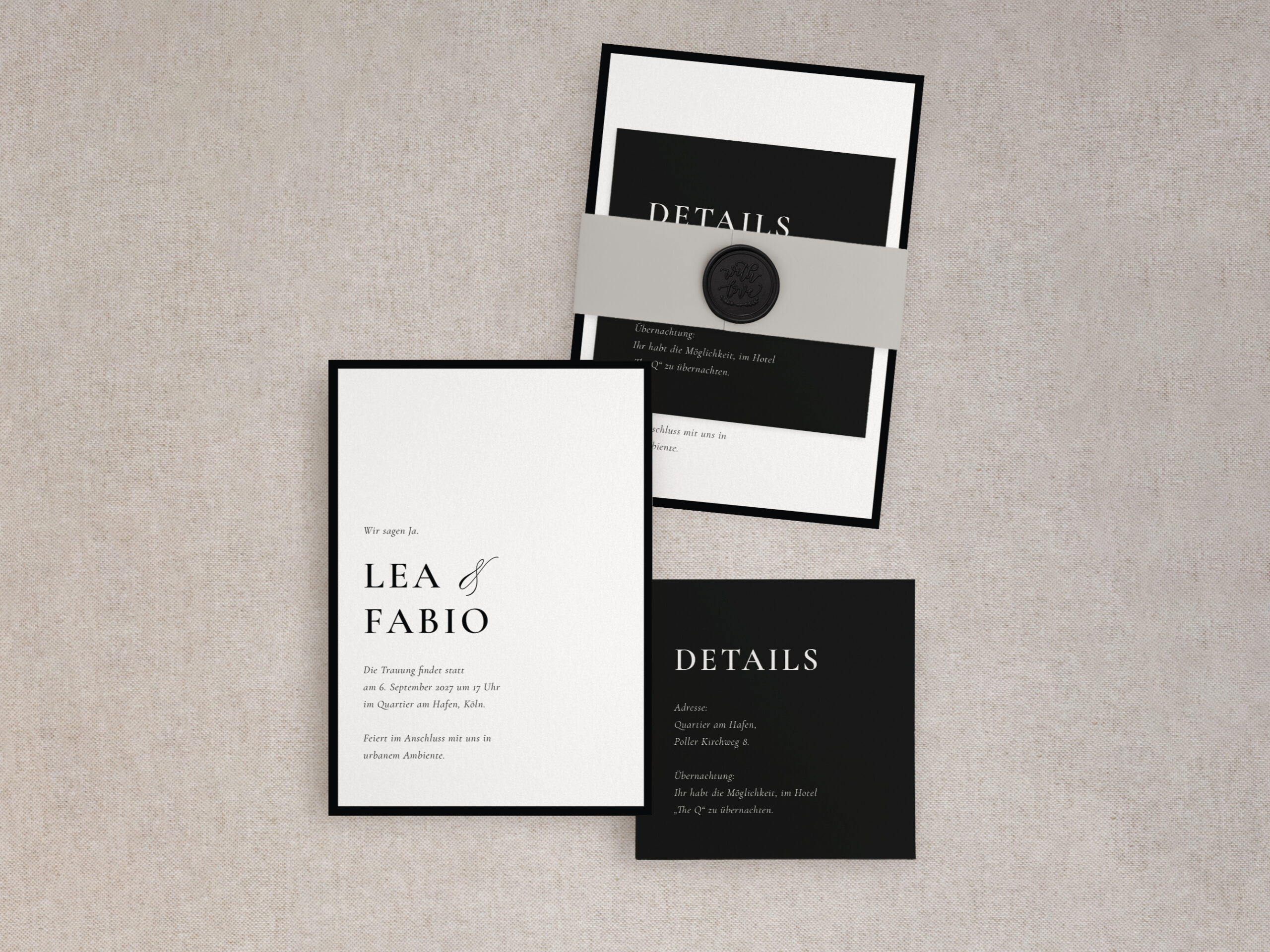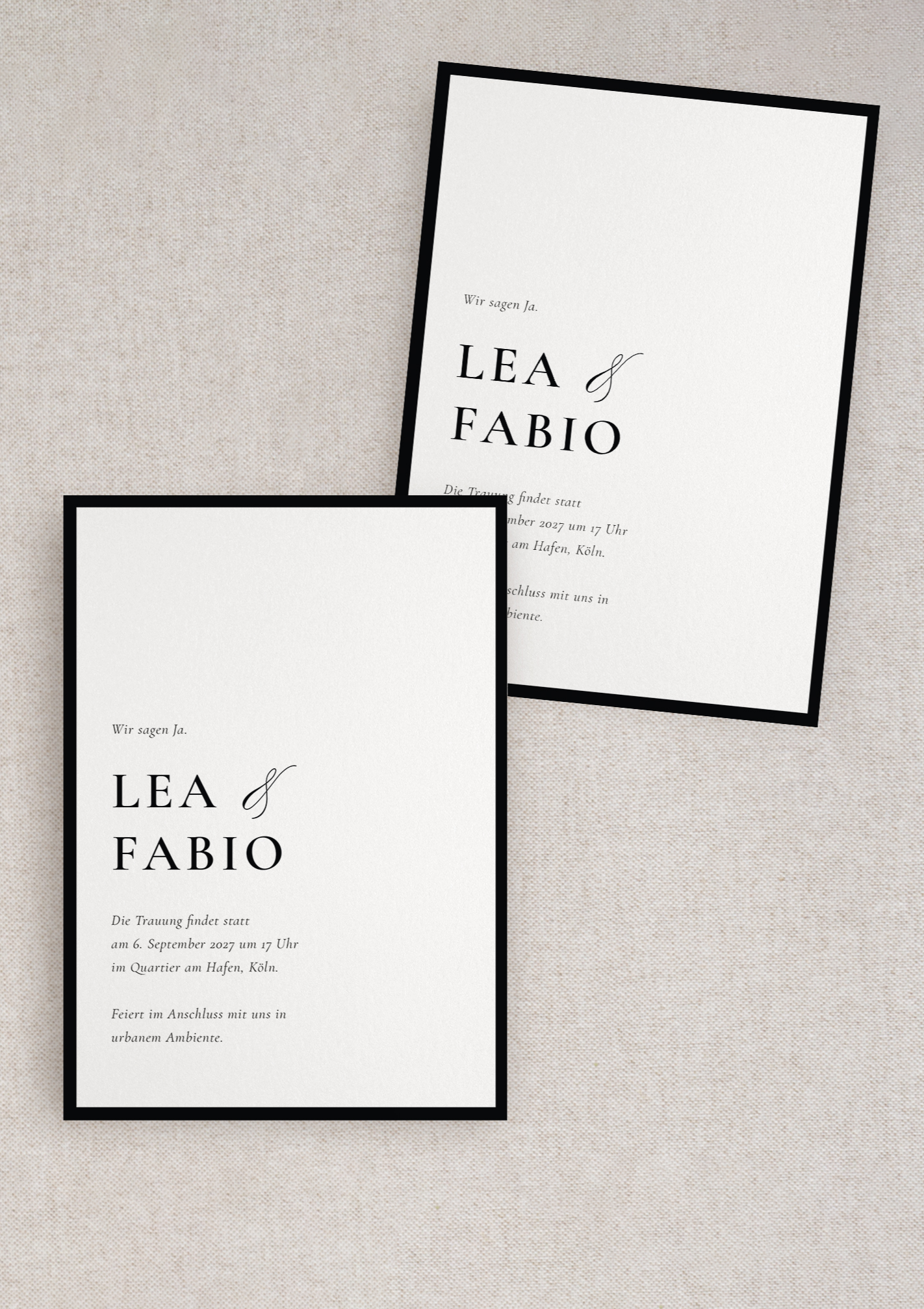 Die Hochzeitseinladung – Modern Noir – lebt von starkem Schwarz-Weiß-Kontrast, klarer Typografie und einer kompromisslos reduzierten Gestaltung – ideal für Paare, die modernes Design, urbane Eleganz und eine selbstbewusst zeitlose Ästhetik schätzen.