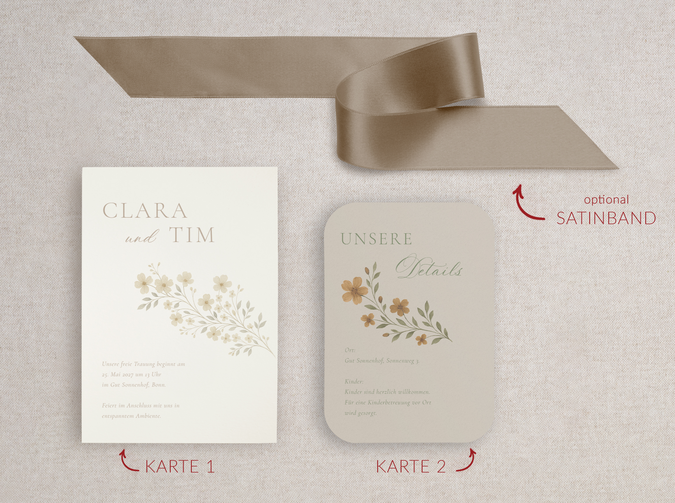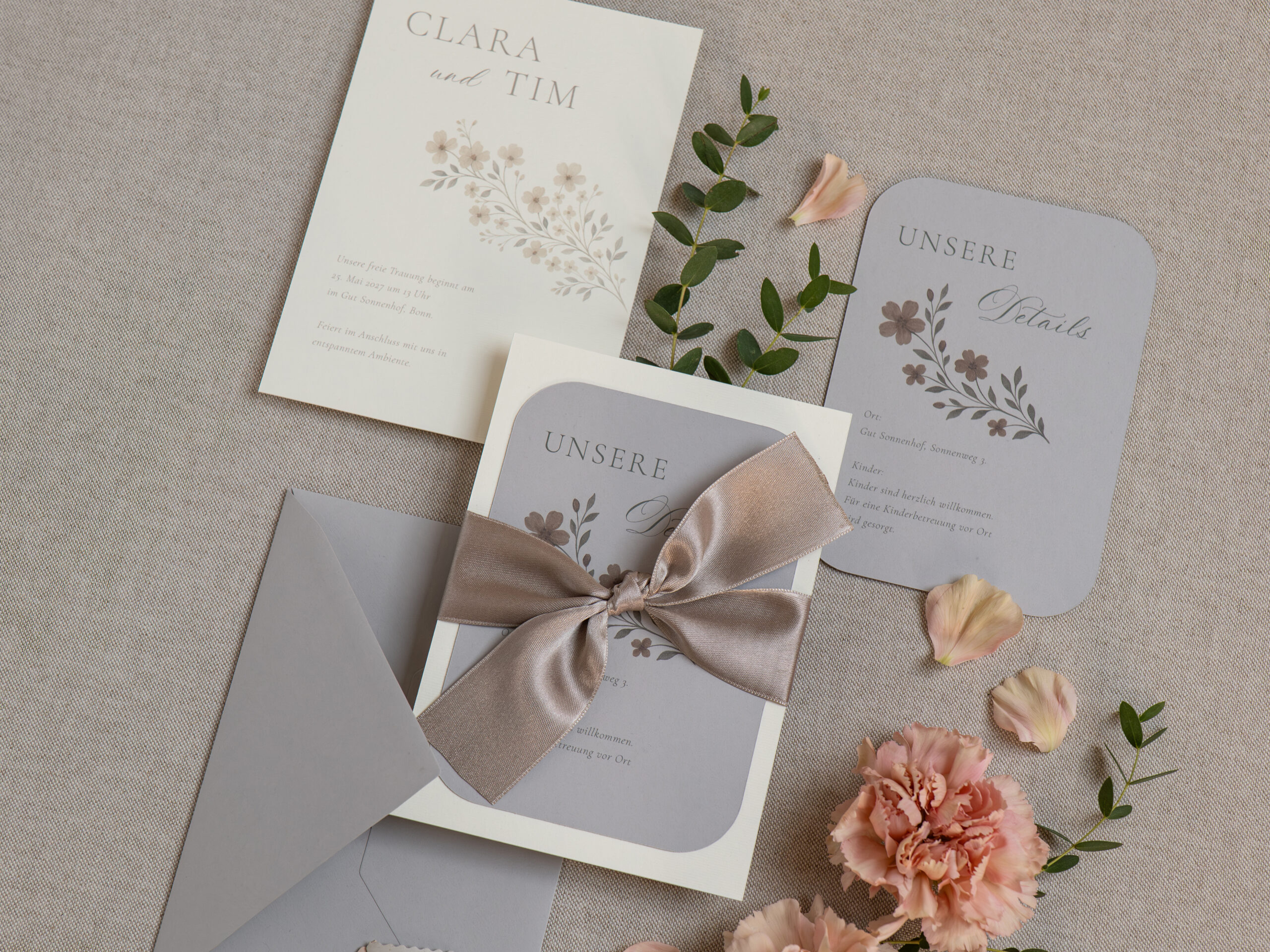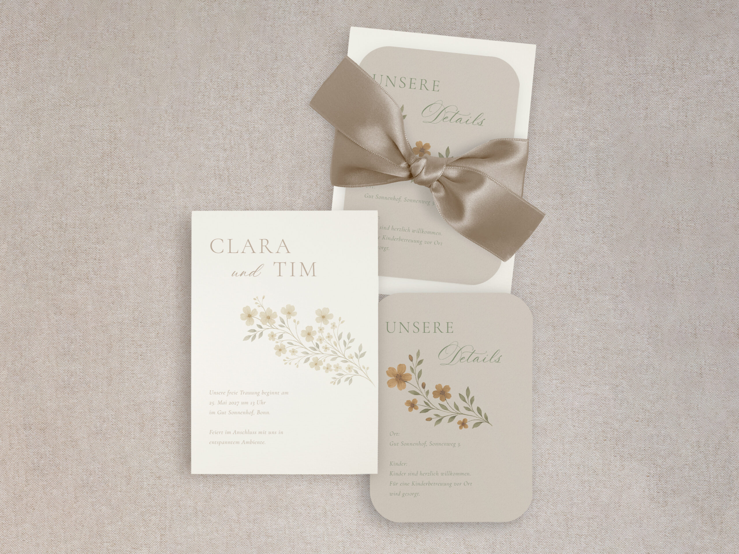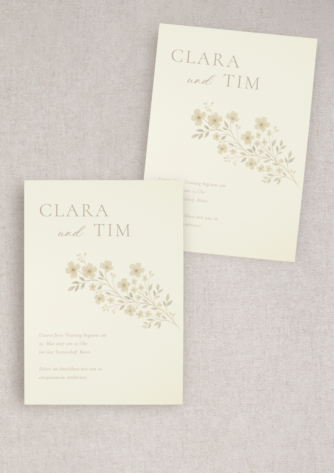 Die Hochzeitseinladung – Soft Bloom – verbindet zarte Blütenillustrationen, weiche Naturtöne und eine sanfte, romantische Leichtigkeit – ideal für Paare, die eine elegante, zeitlose und liebevoll verspielte Papeterie suchen.