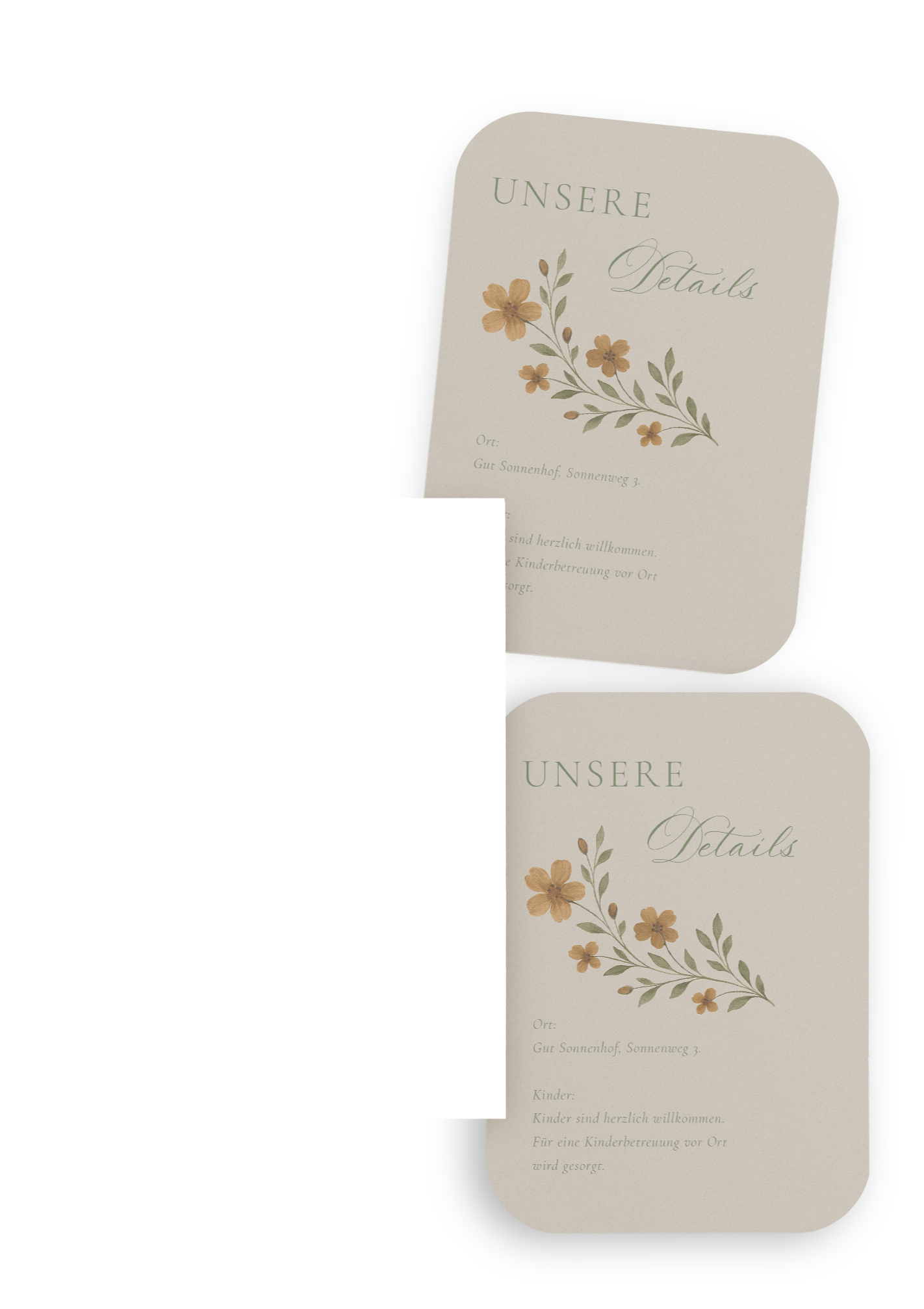 Damit deine Einladung perfekt zu eurem Fest passt, gestalte ich die Details individuell für dich. Sende mir nach der Bestellung einfach eure Texte, Namen und das Hochzeitsdatum. Ich kümmere mich um die professionelle Typografie und das Layout. Auch Farbanpassungen sind möglich – lass uns einfach wissen, welche Farben eure Hochzeit begleiten.