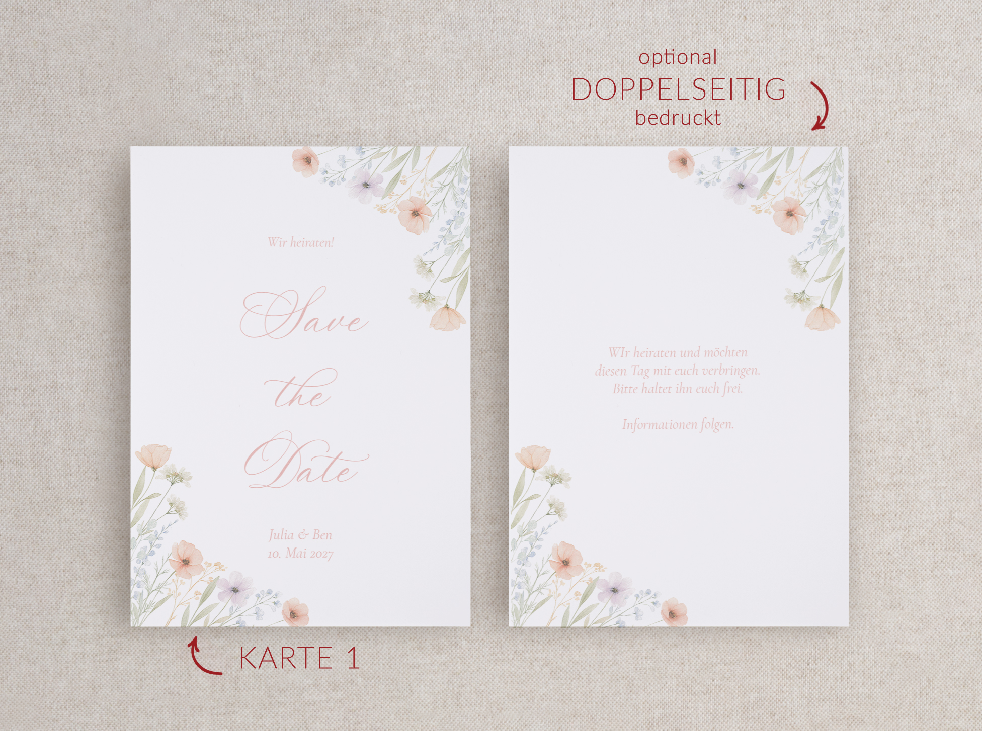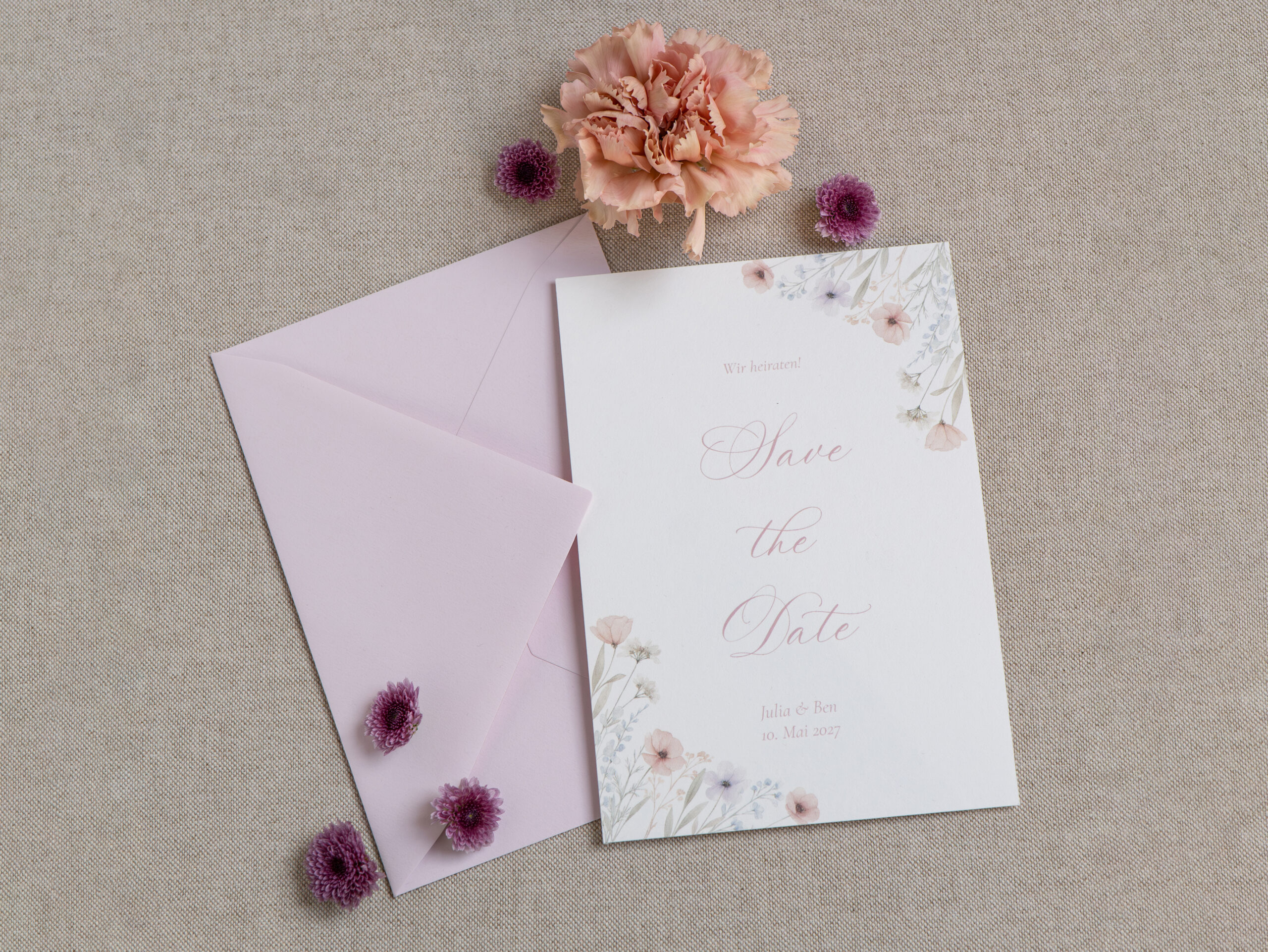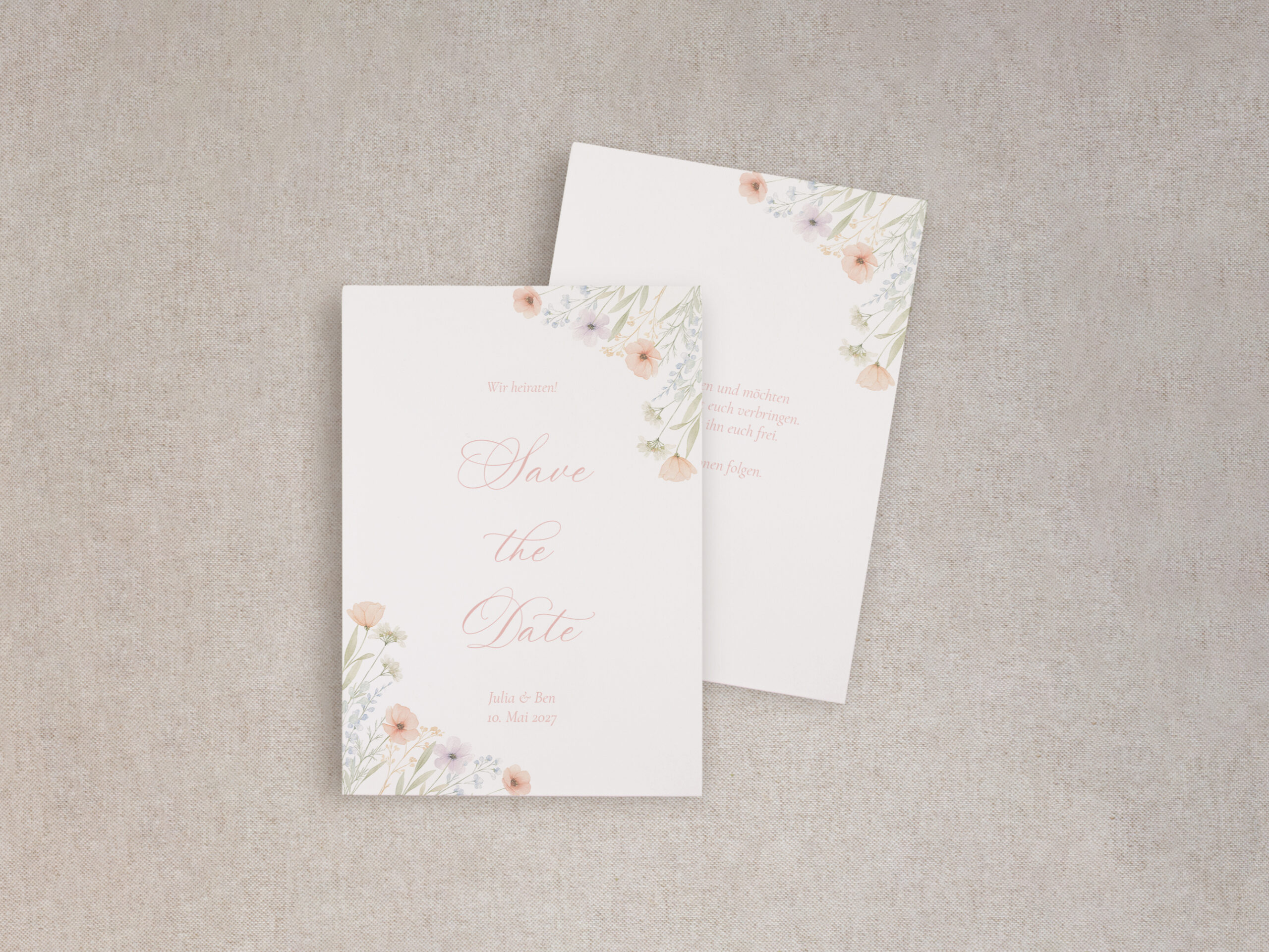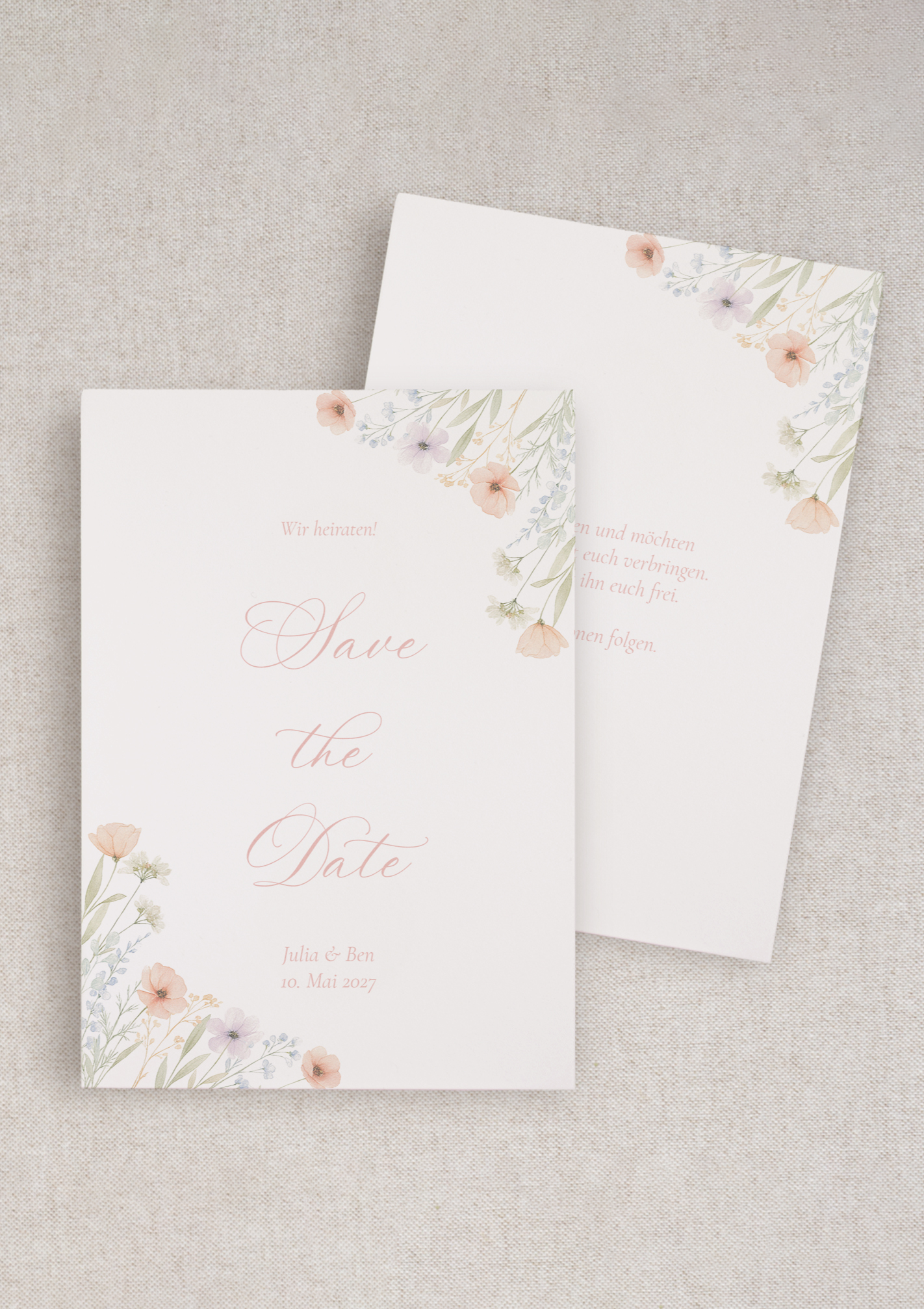 Die Save the Date Karte – Blossom Whisper – vereint zarte Aquarellblüten, feine Pastelltöne und eine leichte, romantische Verspieltheit – ideal für Paare, die den Frühling und eine natürliche, liebevolle Hochzeitsästhetik widerspiegeln möchten.